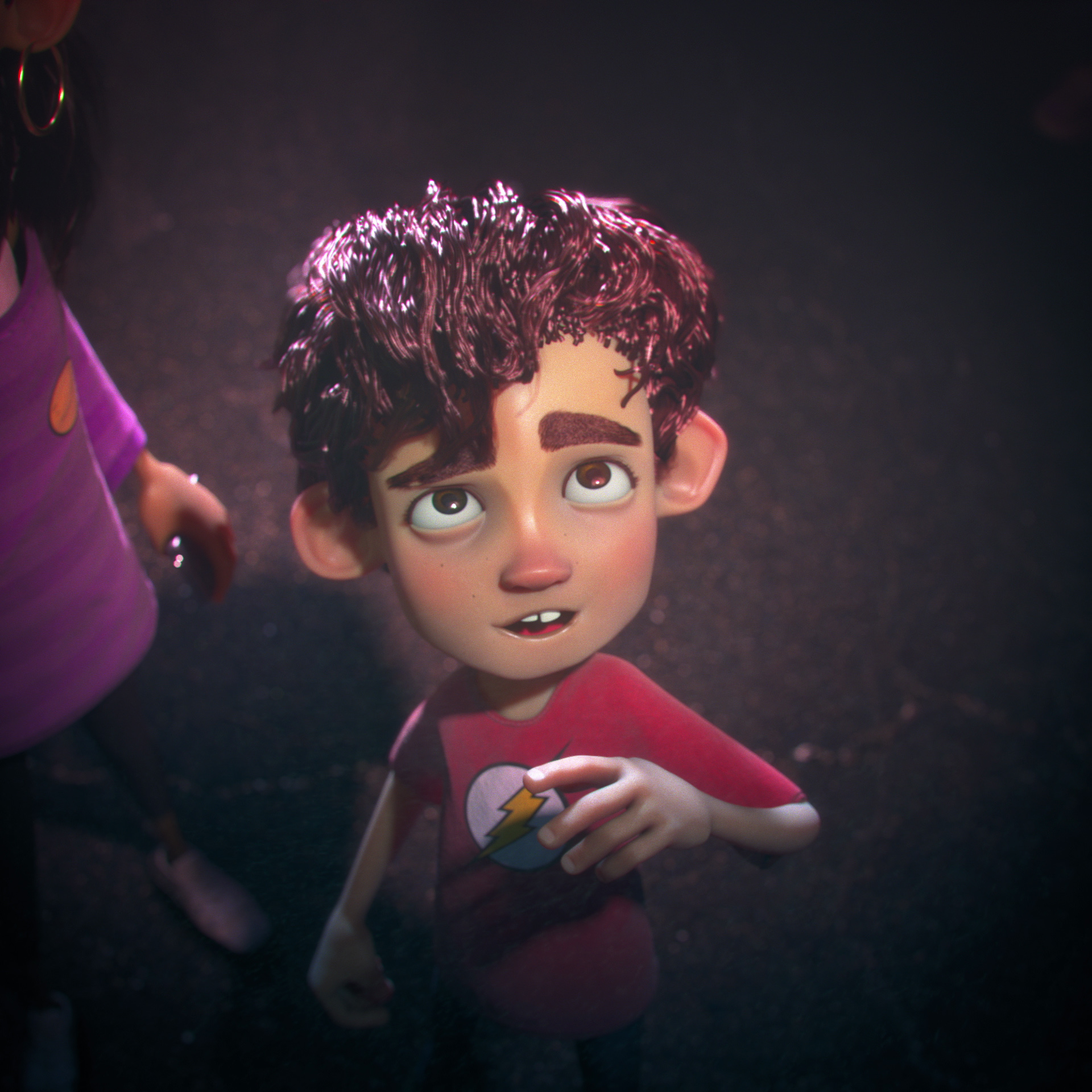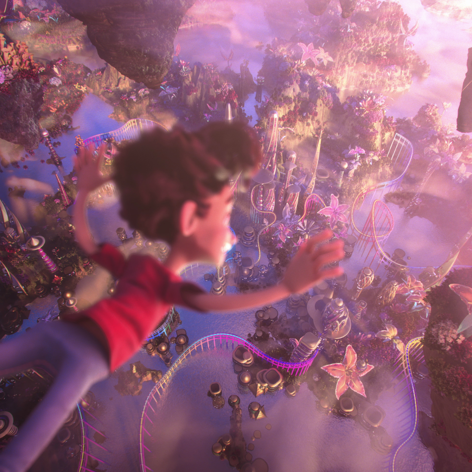 The film is made up of two parts bridged by a magical transition. In the first, we see a CG family in a mundane world, clearly fatigued by the monotony of every-day life: they’re low mood, glued to their phones, frowning. As they trudge through a brutalist-inspired city, the young boy sees a butterfly of glowing colours, and chases it, leading his family to a mystical portal. The characters are then sucked into a shimmering prism that transports them into the glimmering ‘Miral World!’
