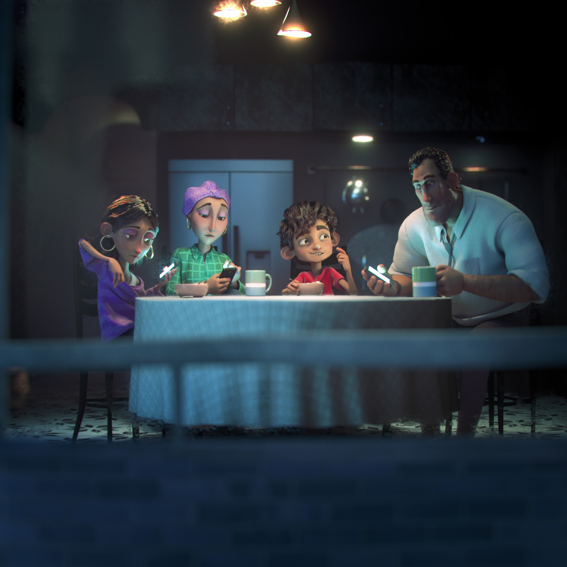 Rick & Mario were inspired by stop-motion when creating the first part of the commercial, which shows the family in a monochromatic and angular world. This was animated at a slightly slower rate every two frames to mimic the stiff movements of claymation characters and emphasise the freedom and joy brought by the World, a place in which their movements become loose and smooth. The colour palette distinction between the first and final parts of the film were also designed to emphasise the general mood of its environment.